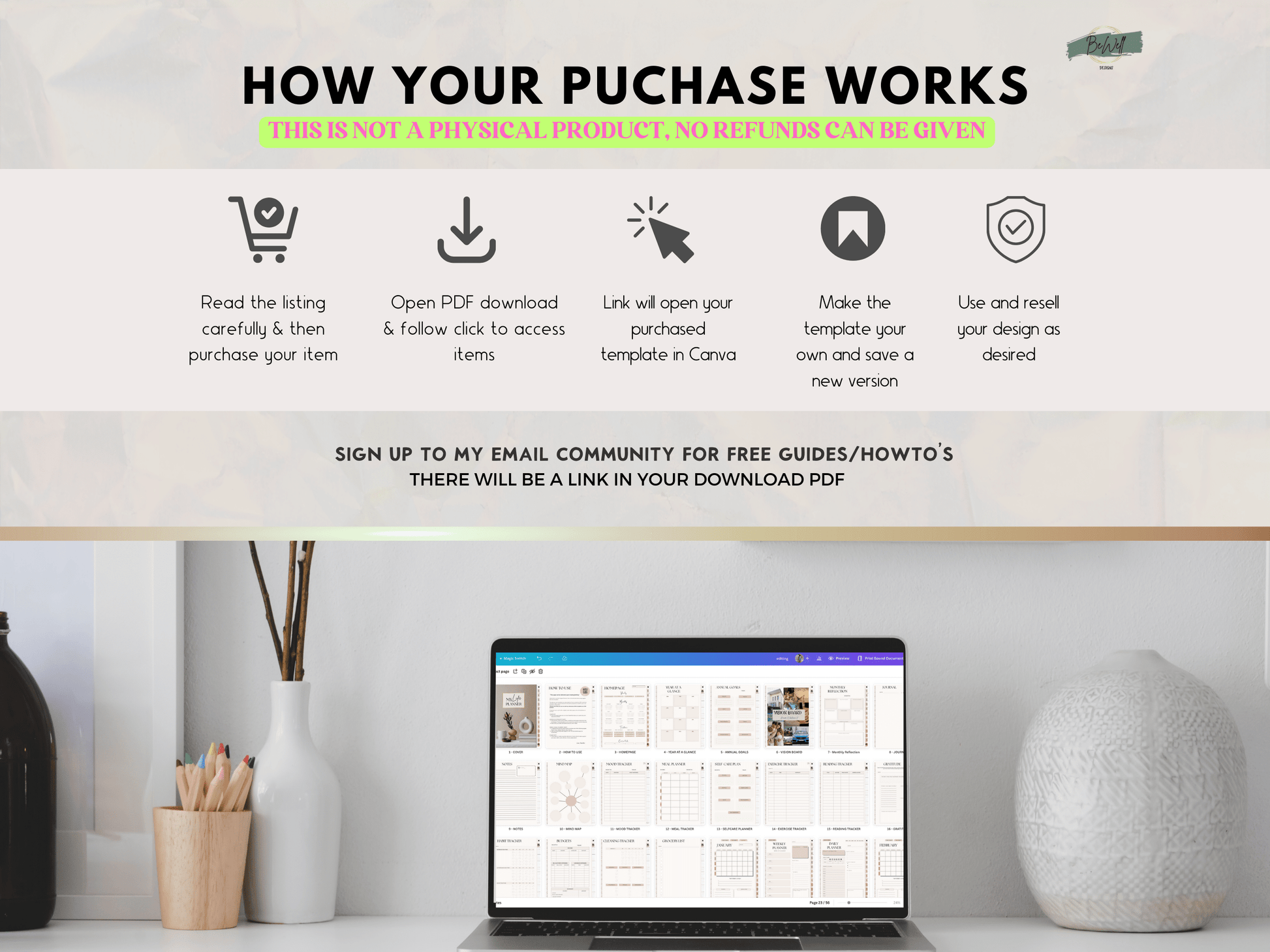 🎁 Bonus Content Galore: Stand out with over 90 Etsy listing mockups and impress with 5 digital download instruction templates that can be used whereever you sell products. Also, get access to our free guides for mastering Canva and Etsy.