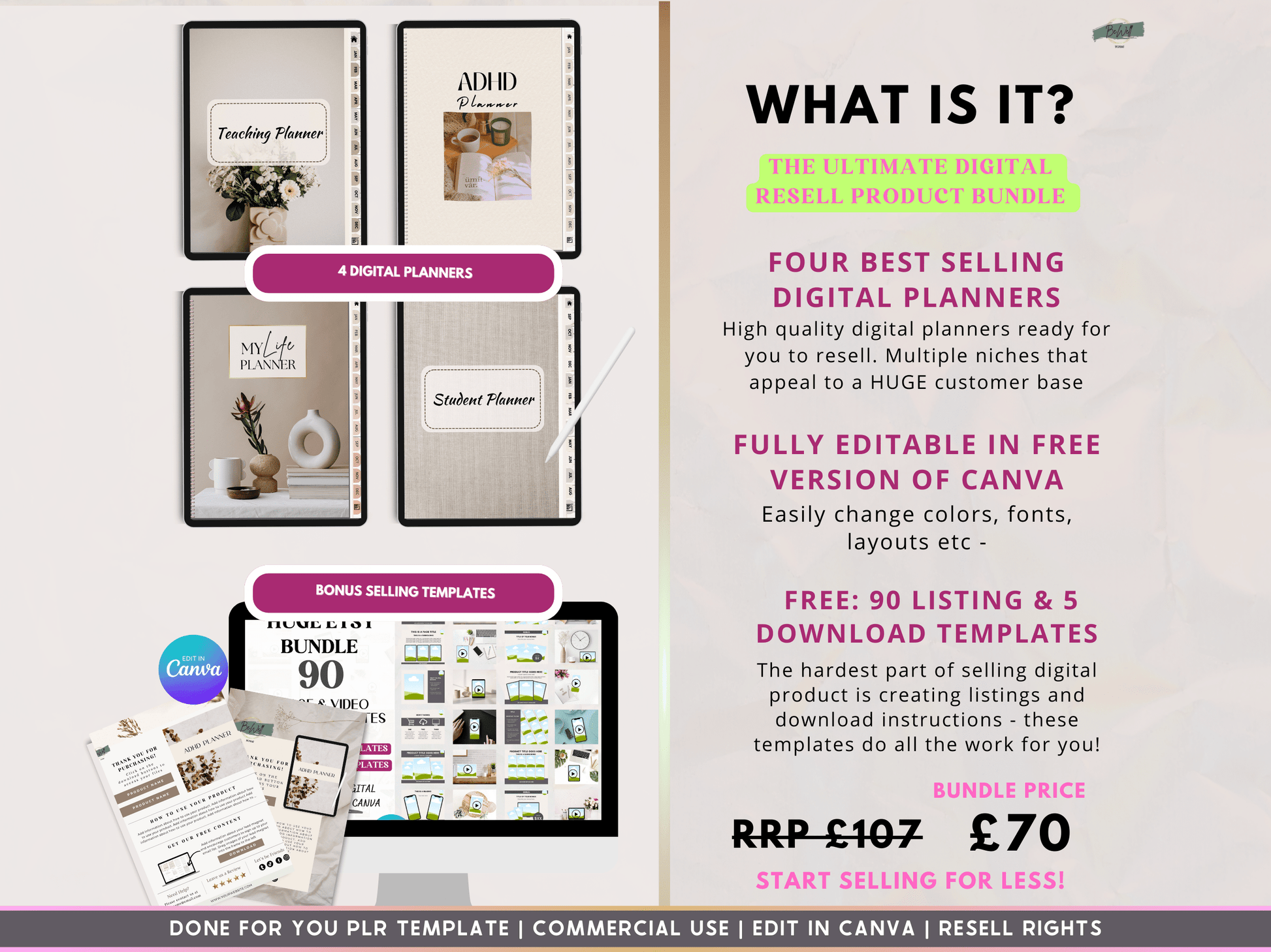 Plus we’ve added 90+ Etsy listing mockups, and a Bundle of 5 digital download instruction templates, 1000+ free digital stickers and a FREE Canva guide to help get you reselling right away!